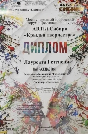 17 и 18 апреля г. Абакан встречал многочисленные творческие коллективы со всех уголков Сибири. А повод — международный фестиваль-конкурс «ARTist Сибири. Крылья творчества». Более 900 участников из Абакана и Хакасии, Красноярского края, Тывы, Новокузнецка, Междуреченска, Кемеровской области, Монголии представили свое творчество в различных номинациях. Вокальный ансамбль «Голос детства» Ермаковской школы № 1 тоже был заявлен в программу конкурса.
