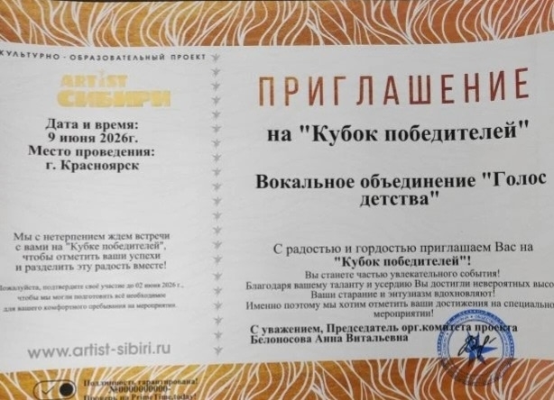 Мы с ребятами тщательно готовились к выступлению — костюмы, реквизит, репетиции. И вот долгожданная поездка и конкурсное выступление! Ярко, эмоционально, красочно прозвучала песня «Заваленка» в исполнении юных вокалистов. Профессиональное жюри высоко оценило исполнительское мастерство эстрадного коллектива. Лауреаты 1 степени и приглашение на «Кубок победителей» в г. Красноярск.